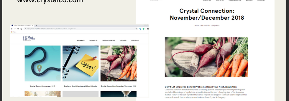 I was responsible for researching and disseminating the latest news in health care compliance and benefits that had an implication on employer-sponsored benefit programs. Key to this initiative was a monthly newsletter, Crystal Connection, which I wrote and made available to employers across multiple channels. The following slides illustrate the distribution strategy: